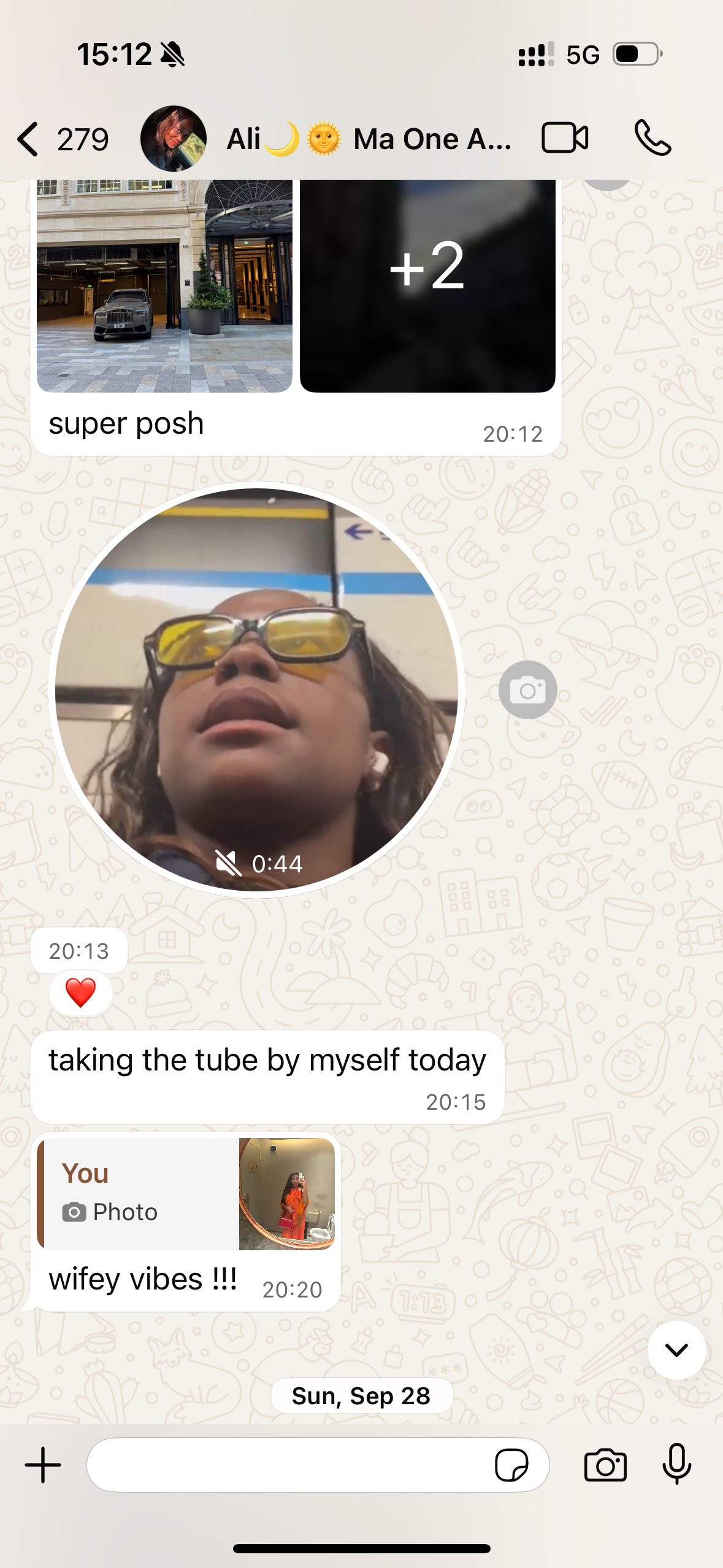 As Ali takes the train by herself for the first time and experiences the poshness of West London’s wealthy neighbourhoods, I go to Marble for the first time celebrating my new job with my mother, gogo and boyfriend. She comments on my outfit in the bathroom while I watch her tube adventures and wash my hands. She helps me decide on how to style my scarf (see below), understanding my creative vision and hyping me up in the girl’s bathroom - like she has our whole lives despite being 14,000 km away, on her way to a brilliant and exciting event. Vivaciously enjoying her own beautiful life and indulging in new experiences while still bearing witness to mine.